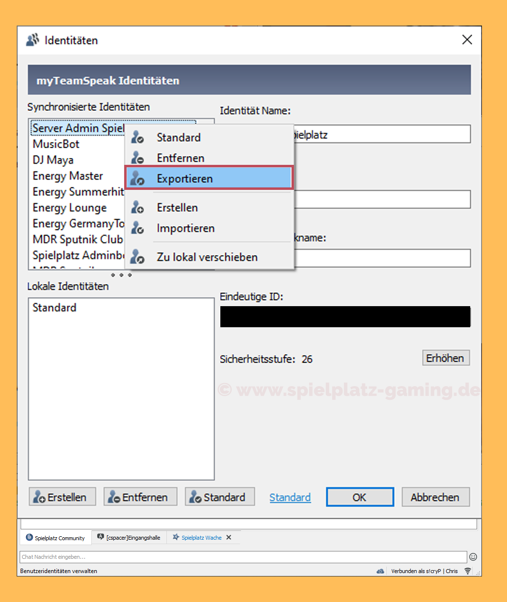 Klicke auf die zu exportierende TeamSpeak – Identität mit einem Rechtsklick und gehe auf -> Exportieren