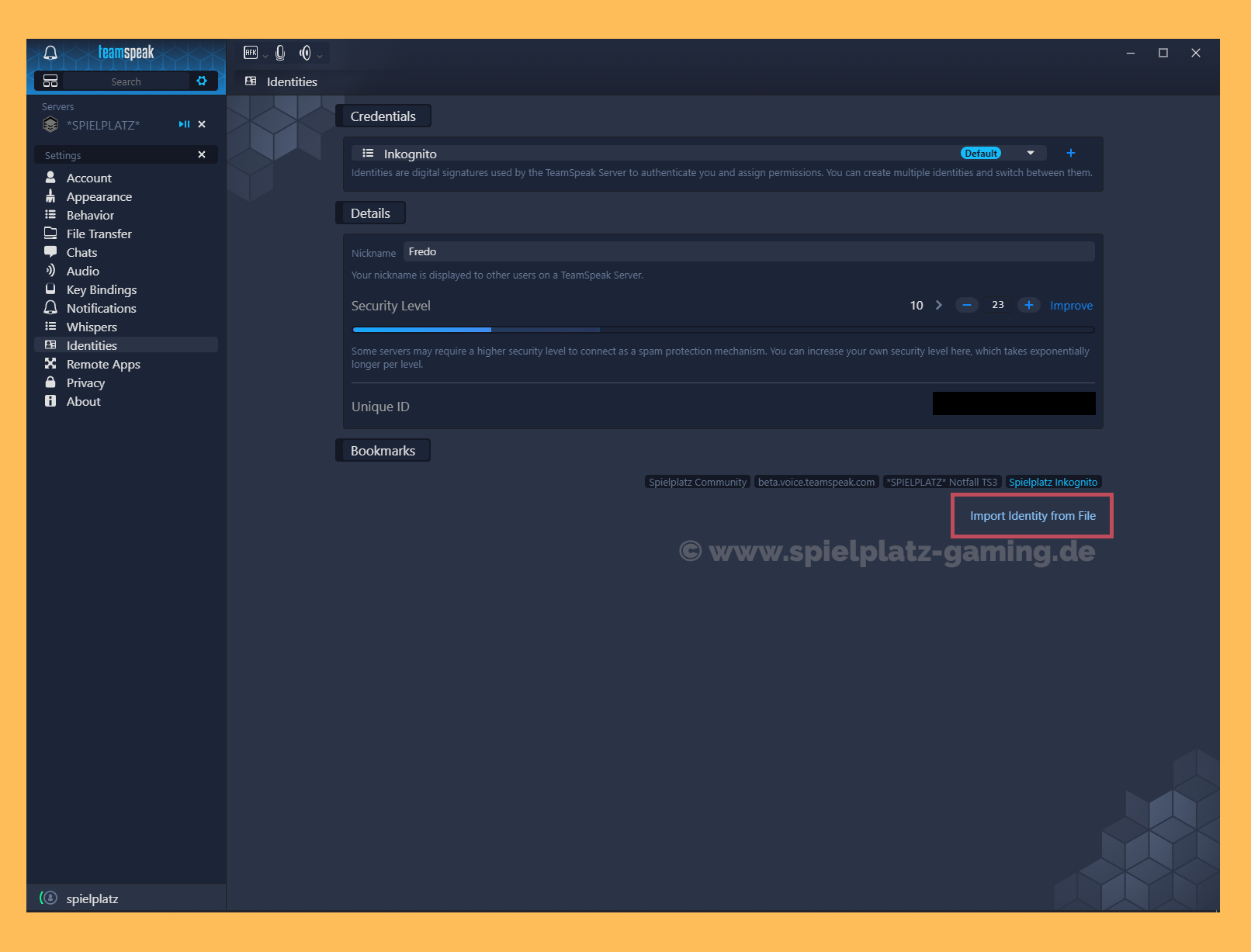 Identity: Die von TeamSpeak3 übertragene Identität übernehmen bzw. auswählen